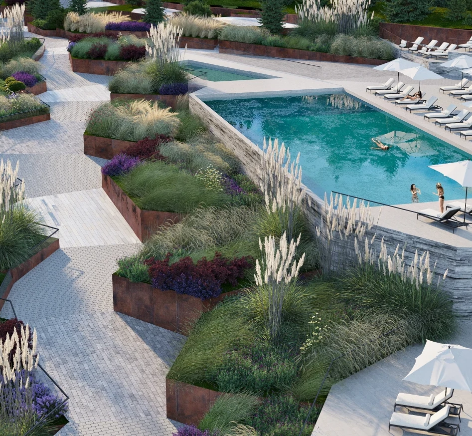 Интерьер отеля оформлен в гармонии с пейзажем хвойного леса и гор, используя строгое дерево, мрамор и матовую фактурную штукатурку. Природные материалы в сочетании с акцентным освещением, комфортабельными лаундж-зонами и выразительными лобби и баром создают атмосферу премиальности и уюта горного отеля.